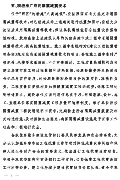 《建設(shè)工程抗震管理條例》(國令第 744 號)第十六條:建筑工程根據(jù)使用功能以及在抗震救災(zāi)中的作用等因素,分為特殊設(shè)防類、重點設(shè)防類、標準設(shè)防類和適度設(shè)防類。學(xué)校、幼兒園、醫(yī)院、養(yǎng)老機構(gòu)、兒童福利機構(gòu)、應(yīng)急指揮中心、應(yīng)急避難場所、廣播電視等建筑,應(yīng)當按照不低于重點設(shè)防類的要求采取抗震設(shè)防措施。位于高烈度設(shè)防地區(qū)、地震重點監(jiān)視防御區(qū)的新建學(xué)校、幼兒園、醫(yī)院、養(yǎng)老機構(gòu)、兒童福利機構(gòu)、應(yīng)急指揮中心、應(yīng)急避難場所、廣播電視等建筑應(yīng)當按照國家有關(guān)規(guī)定采用隔震減震等技術(shù),保證發(fā)生本區(qū)域設(shè)防地震時能夠滿足正常使用要求。國家鼓勵在除前款規(guī)定以外的建設(shè)工程中采用隔震減震等技術(shù),提高抗震性能。 | | | | |